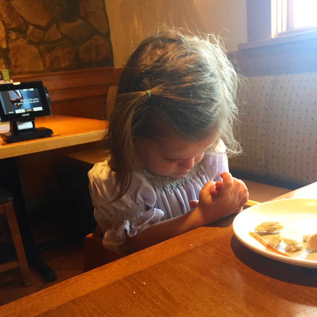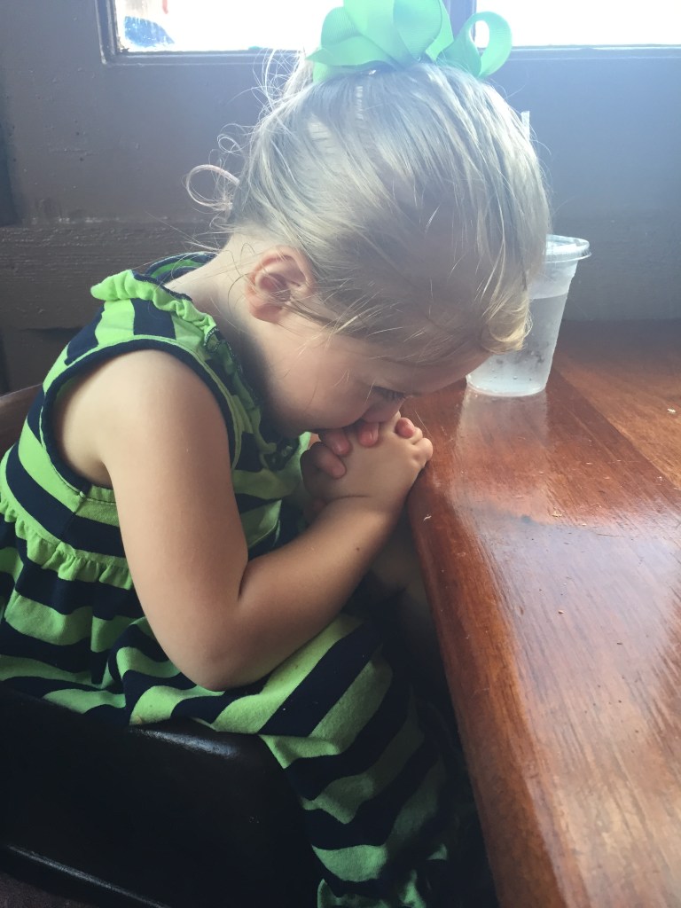 Each night right before we tuck the girls into bed, we all hold hands and go around in a circle and pray. The girls have to take turns each night as to who gets to start it and who ends it. We hold hands and whoever starts the prayer will then squeeze the hand of the person they want to go next until it comes to the last person who will finish out the prayer with an “amen.” Sometimes the prayers are very short and John and/or I say a majority of it, while other nights, the girls thank God for everything from the sunshine that morning to the fan in their bedrooms at night. Some nights I laugh at the things they say and I can imagine God smiling too because let’s face it… kids are funny and brutally honest- even during their prayers.