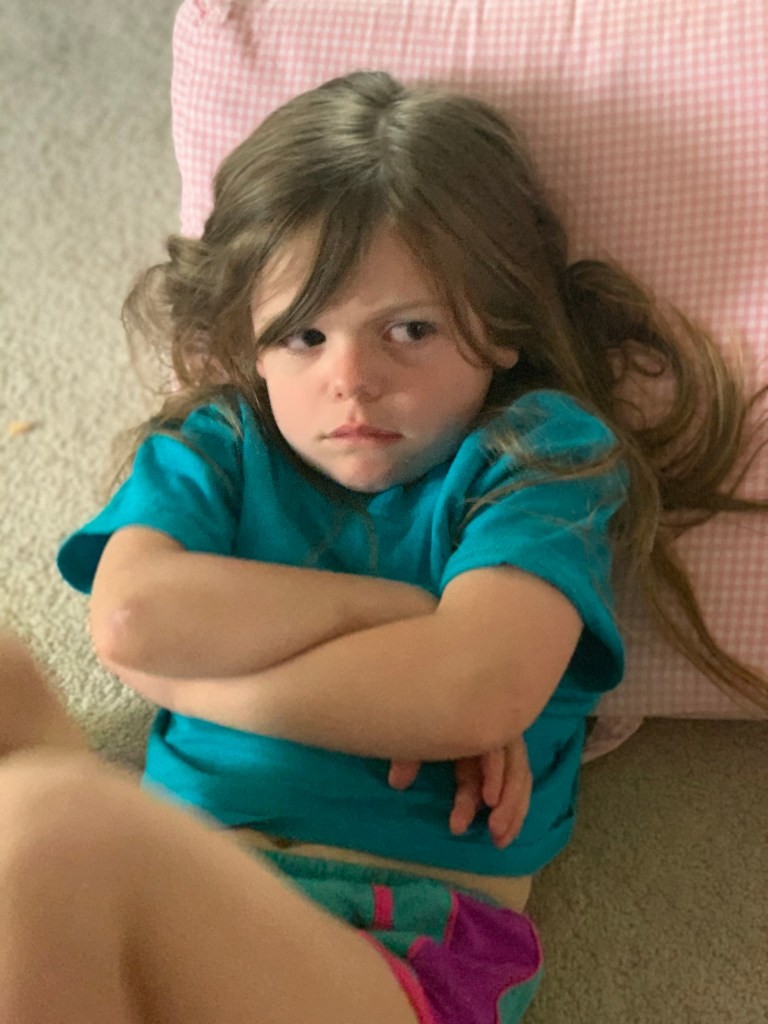 Though Carly’s hair seems to tangle more than Bella Kate’s, it is Bella Kate that hates brushing her hair the most. Bella Kate seems to take it as a personal attack. She glares at me as if I am trying to torture her on purpose! Sometimes she screams or cries. She has even been known to hit the sink in frustration! Y’all, one day, she kicked at me while I was doing her hair. (Let’s just say, that was the only time she did that!) Believe it or not, we have the most gentle (wet) hair brush we could find. I would have LOVED to have traded out that old pink brush for this one, but it doesn’t matter. She has thick hair like her momma and her head is tender, also like her momma, so it just hurts. Tangles hurt! Tangles are messy! But you have to brush the tangles out to have smooth hair! It’s just something you have to do.