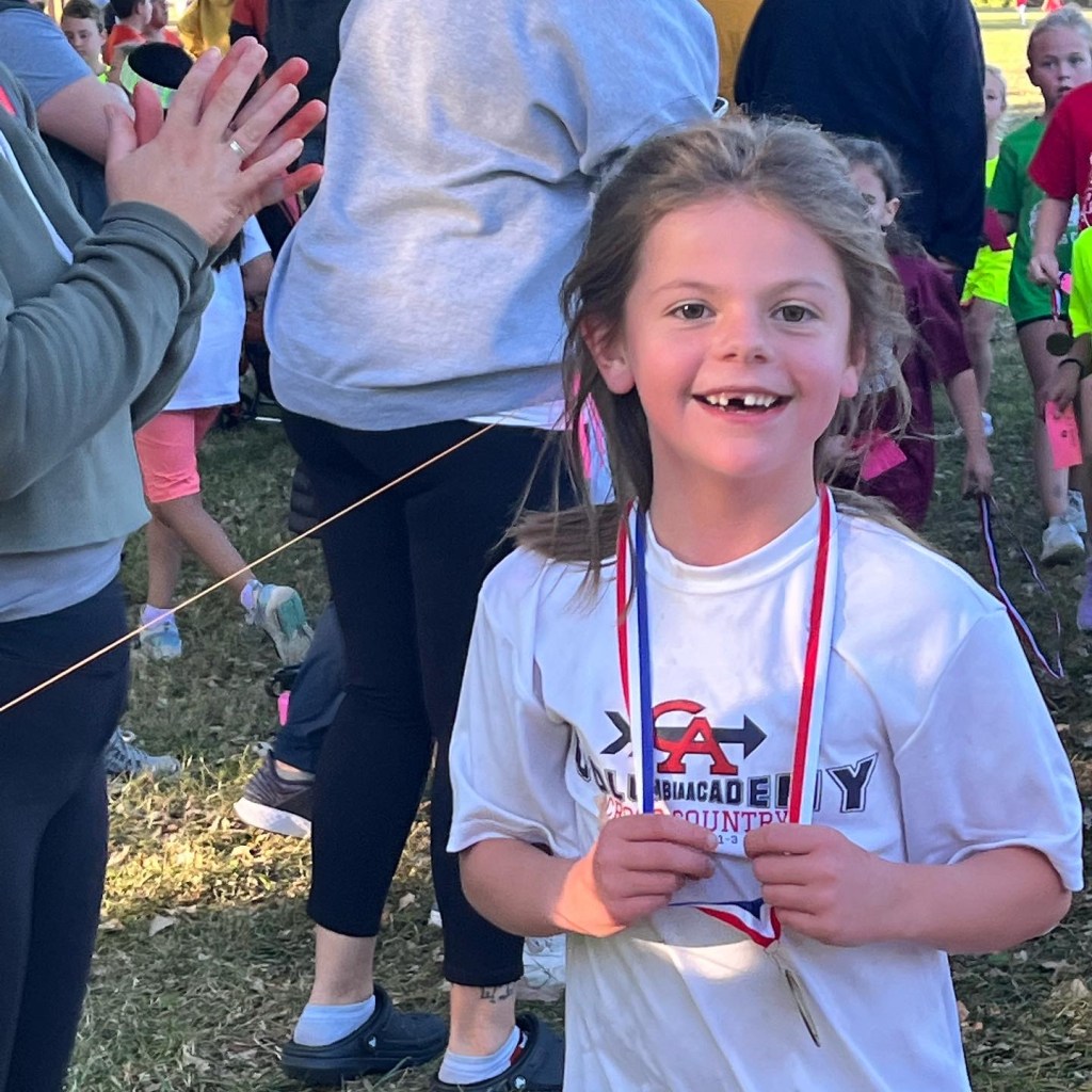 Once she had a little while to cool off and then experienced the after season party, Carly decided to give it another shot. So the next year, both girls once again ran cross country. At the first meet, Bella Kate did really well and was so proud of herself. (Even though she was in the last portion of the runners to finish, she did her very best which made us so proud too. She actually ended the season with the most improved time.) She kept a positive attitude and honestly that is what makes my momma heart the proudest.