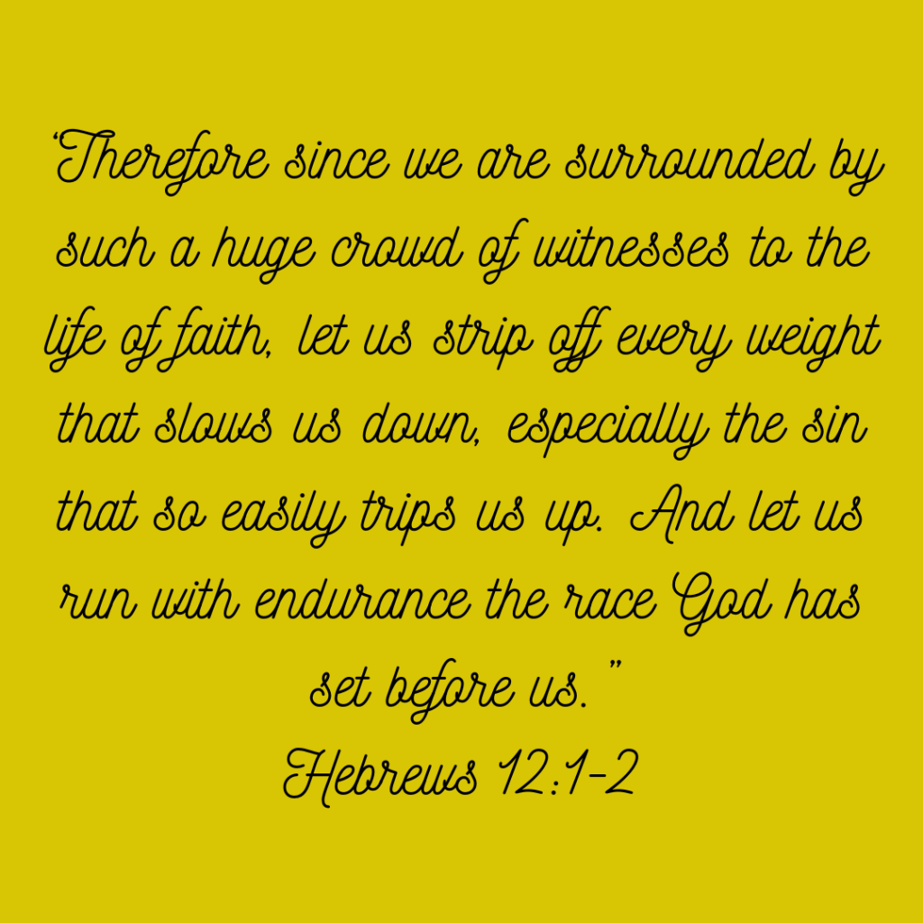 I am reminded of Hebrews 12:1-2 which says “Therefore since we are surrounded by such a huge crowd of witnesses to the life of faith, let us strip off every weight that slows us down, especially the sin that so easily trips us up. And let us run with endurance the race God has set before us.”